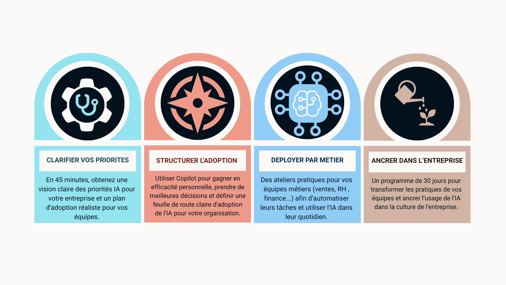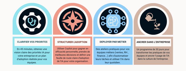 Progression guidée : de l’identification des cas d’usage IA à l’adoption quotidienne et durable.